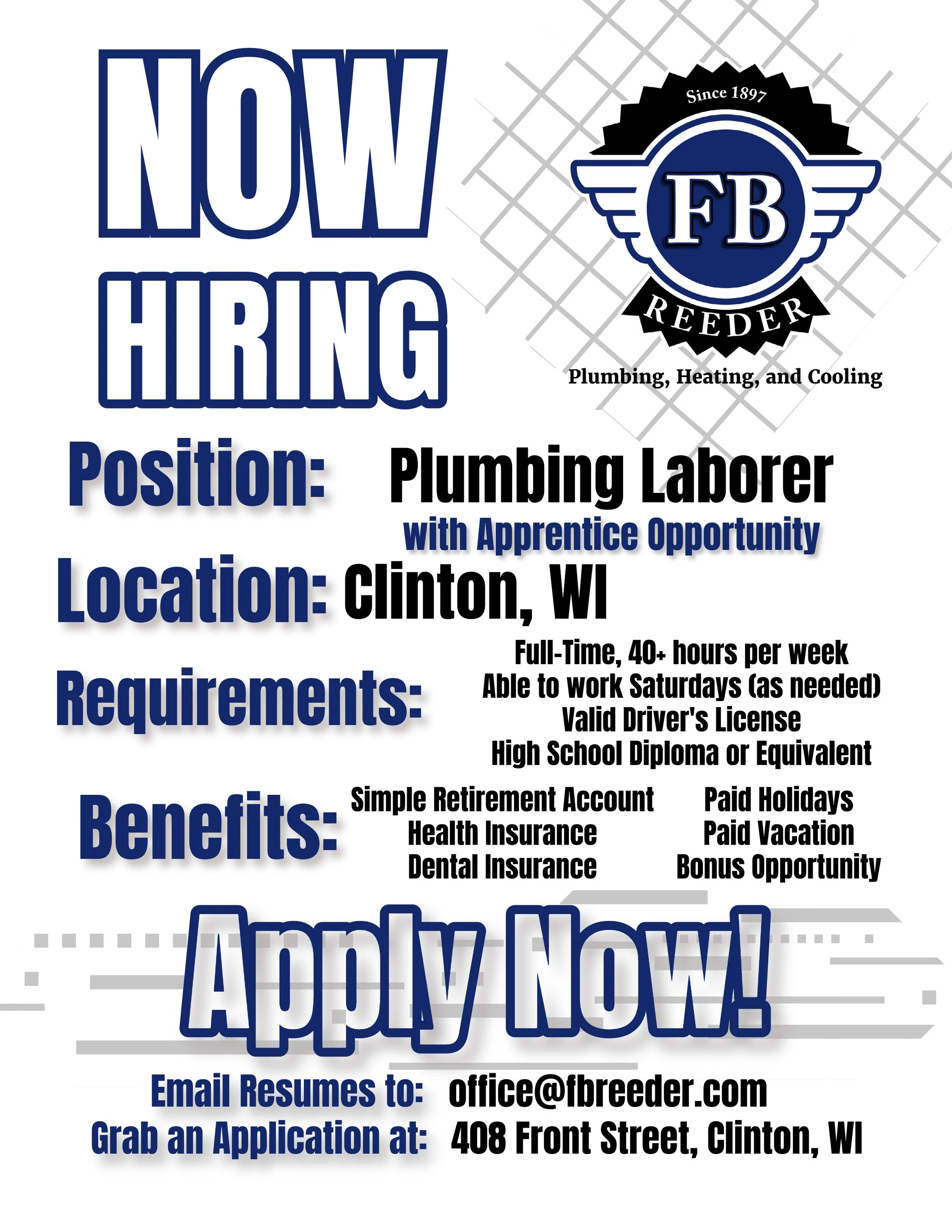 We started out as a family-owned hardware store that has grown into a thriving residential plumbing, heating, and cooling business. We pride ourselves with great customer service and exceptional work ethic. There are many awards that we have received over the years that prove that FB Reeder is a quality business to work for. Our family friendly small business has been growing at a substantial rate and are looking to add to our employee base.